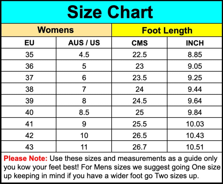 Please Note: Use these sizes and measurements as a guide only. You know your feet best! Also remember your left and right foot will vary in length and width, so choose the size you think will be most comfortable for you.